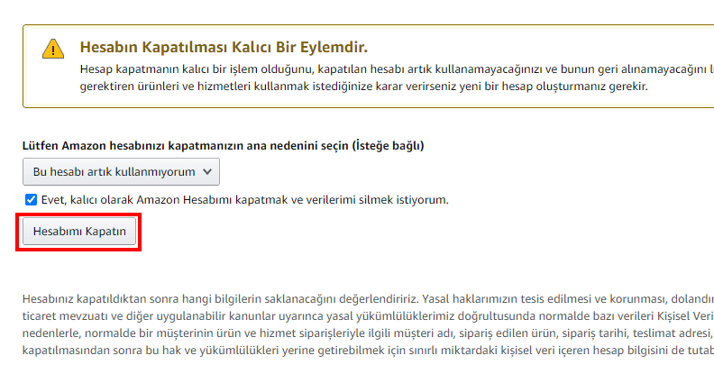 NOT: Hesap kapatmanın kalıcı bir işlem olduğunu, kapatılan hesabı artık kullanamayacağınızı ve bunun geri alınamayacağını lütfen unutmayın. Daha sonra tekrar bizden sipariş vermek veya hesap gerektiren ürünleri ve hizmetleri kullanmak istediğinize karar verirseniz yeni bir hesap oluşturmanız gerekir.