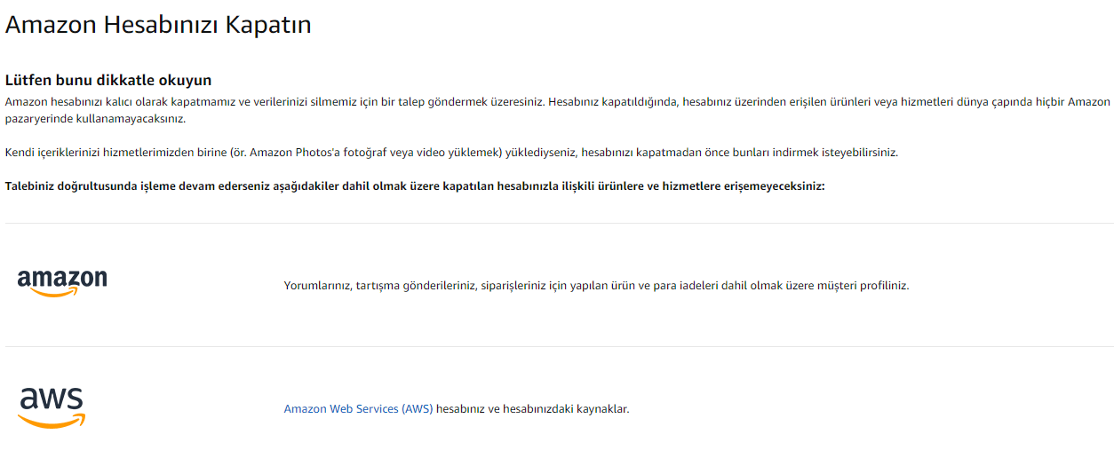 Amazon hesabınızı kalıcı olarak kapatmamız ve verilerinizi silmemiz için bir talep göndermek üzeresiniz. Hesabınız kapatıldığında, hesabınız üzerinden erişilen ürünleri veya hizmetleri dünya çapında hiçbir Amazon pazaryerinde kullanamayacaksınız. Amazon hesabınıza bağlı listedeki tüm hizmetlerin kapatılacağını unutmayın.