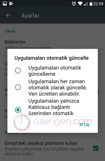 Google play’de güncelleme ayarları varsayılan olarak, sadece Wi-fi ağında otomatik güncellemeye ayarlıdır. Bu sayede mobil kotanızın dolmadan sadece kablosuz ağa giriş yaptığınız zaman güncellemeler otomatik olarak yapılmaktadır. En doğru güncelleme ayarı da böyle olmalıdır.