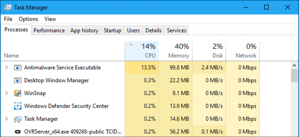 Antimalware Service Executable işleminin büyük miktarda CPU veya disk kaynağı kullandığını görürseniz, muhtemelen bilgisayarınızı kötü amaçlı yazılımlara karşı taramaktadır. Diğer virüsten koruma araçları gibi, Windows Defender da bilgisayarınızdaki dosyaları arka planda düzenli olarak tarar.