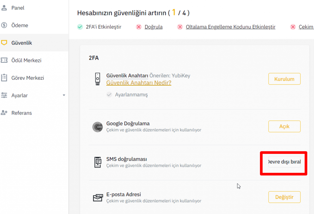 Ardından SMS Doğrulama’nın yanındak Devre Dışı Bırak seçeneğine tıklayın.