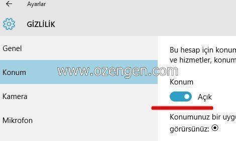 Burada açılan seçeneklerden konum ayarlarına girerek Konum sekmesini kapalı duruma getirin.