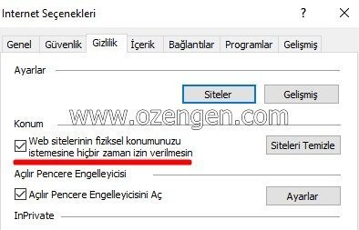 Açılan ekranda Gizlilik sekmesine tıklayarak “Web sitelerin fiziksel konumunuzu istemesine hiçbir zaman izin verilmesin” seçeneğinde bulunan tiki işaretleyin.