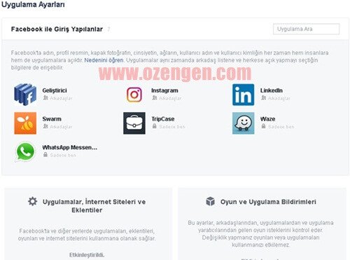 Uygulama ayarları ekranında Facebook ile giriş yapılan uygulama listesini , izin verdiğimiz eklentiler, siteler ve oyunlar gibi tüm izinleri görebilirsiniz. Burada kaynağını bilmediğiniz bir uygulama varsa kaldırmanız gerekiyor.