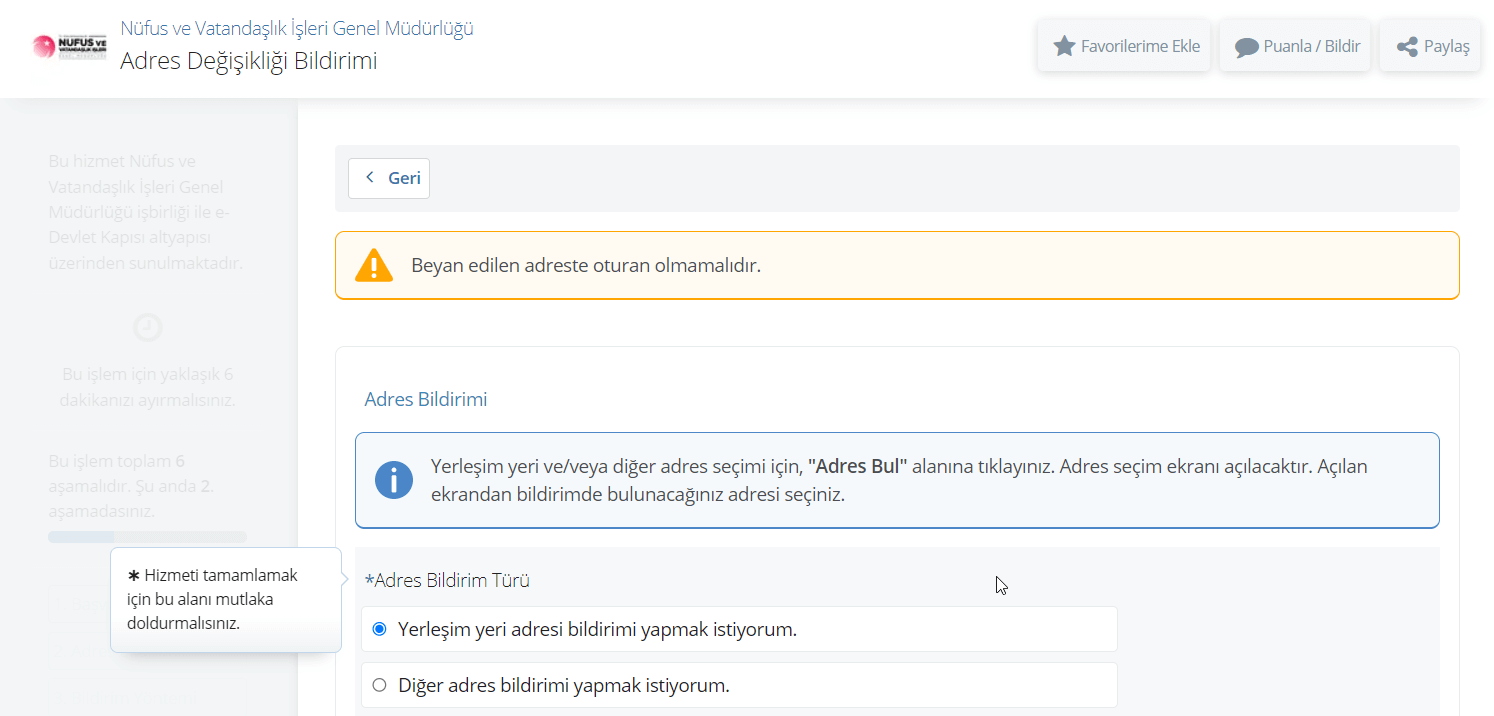 Adres ve kişi seçimini yaptıktan sonra “Beyan edilen adreste oturan olmamalıdır” hatasını alıyorsanız, muhtemelen değişiklik yapmak istediğiniz adreste henüz değişiklik yapmayan biri vardır. Sizden önce oturan kişi ile irtibatınız varsa iletişime geçerek öncelikle onun değişiklik yapmasını beklemelisiniz. 1-2 gün sonra siz de değşiklikğinizi sorunsuz yapabilirsiniz.
