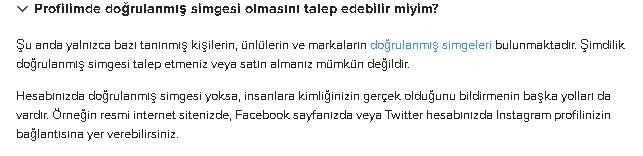 , arama ve profilde Instagram hesaplarının yanında görünen , hesabın ilgili kullanıcıya ait olduğunun onaylandığını gösteren bir simgedir. Anlamı, Instagram’ın bu hesabın tanınmış kişiyi, ünlüyü veya global markayı temsil eden gerçek hesap olduğunu onaylamış olmasıdır.Tanınmış kişilerin ve markaların taklit edilme olasılığı yüksek olduğundan, bu kişi ve markaları temsil eden hesaplar doğrulanır. Instagram topluluğundaki insanların takip etmek istedikleri gerçek kişi ve markaları kolayca bulmalarını istiyoruz.