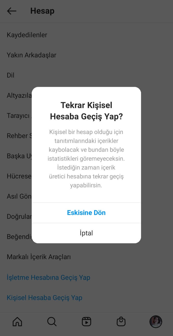 Önemli Not: Kişisel hesaba her geçişinizde Instagram’daki istatistik verileriniz silinir. İşlem bu kadar, artık ilgili hesabı kişisel hesap olarak kullanabilirsiniz. Tekrar hesabı işletme yani marka hesabına geçirmek isterseniz yine bu adımlar yoluyla fakat bu kez İşletme Profiline Geçiş Yap seçimi ile geçiş yapabilirsiniz.
