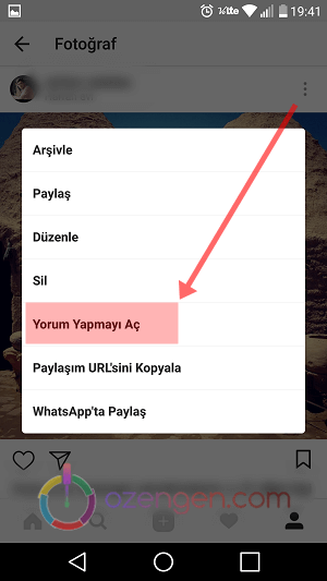 Paylaşımınızın hemen yanında bulunan ayarlar simgesine dokunun. Açılan seçeneklerden “Yorum Yapmayı Aç” seçeneğini işaretleyin.