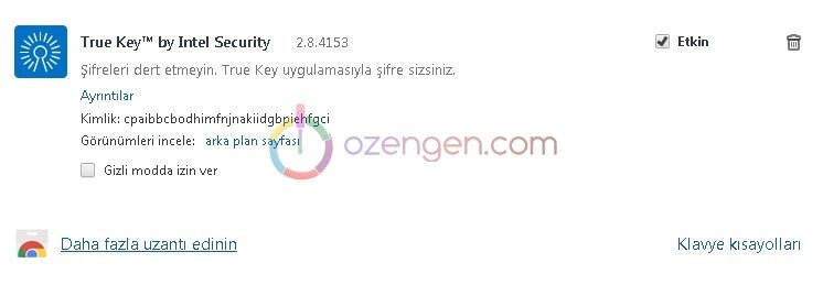 Tarayıcımızın eklenti sayfasına giriş yaptıktan sonra ; True Key by Intel Security eklentisinin yanında bulunan çöp kutusuna tıklayarak eklentiyi kaldırıyoruz.