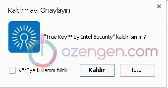 Kaldırmayı onaylayın “True Key by Intel Security” kaldırılsın mı ?” seçeğine Kaldır diyerek devam ediyoruz. Dilerseniz Kötüye kullanım bildir seçeneğini işaretleyerek uygulamayı şikayet edebilirsiniz.