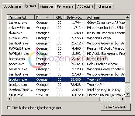 CTRL + ALT + DELETE tuş kombinasyonunu kullanarak görev yöneticisine giriş yapın. Arka planda çalışan tüm True Key ve McAfee.Truekey yazılımlarını tek tek seçerek işlemi sonlandırın. Yani yazılımların arka planda çalışmasını engelleyin.