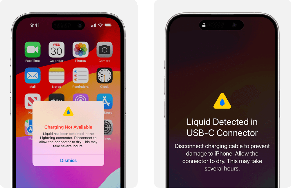 Apple’ın iOS işletim sistemi, Lightning bağlantı noktasında sıvı tespit ettiğinde kullanıcıyı uyarır ve cihazın zarar görmesini önlemek için şarj işlemini engeller. Uyarı mesajı şu şekilde olabilir: