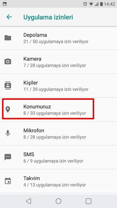 Bu alanda tüm uygulama izinlerini görebilirsiniz. Konum izinlerini takip etmek için “Konumunuz” seçeneğine giriş yapıyoruz.