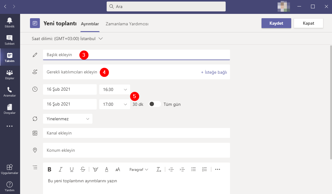 Son olarak ayrıntı ekranında toplantı ile ilgili detayları yazarak “Kaydet” seçeneğine tıklayabilirsiniz.