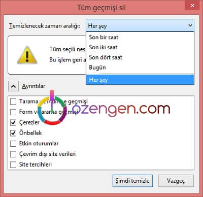 - Eğer Mozilla Firefox’u yüklediğinizden bu zamana kadar olan geçmişinizi silecekseniz “Temizlenecek zaman aralığı” kısmından Her şey seçeneğini seçin. Ayrıntılar kısmından bütün kutucukları işaretleyin ve Şimdi temizle
