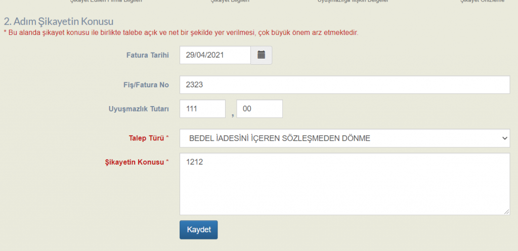 2. Adım Şikayet bilgileri