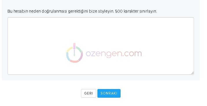 Son olarak “bu hesabın neden doğrulanması gerektiğini bize söleyin” alanında, neden hesabınızı doğrulamak istediğinizi açık ve net bir şekilde ifade edin. Burada yapmış olduğunuz açıklamalar, tıpkı diğer işlemler gibi oldukça önemlidir. Gereksiz ifadeler kullanmaktan kaçınarak net bir ifade dili kullanın.