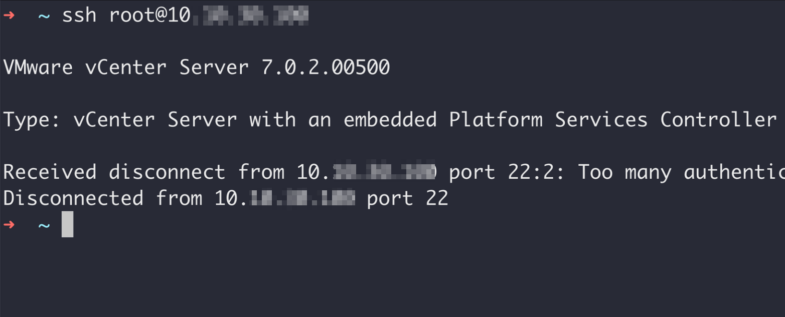 Artık “Too many authentication failures” hatası almadan vCSA’ya kullanıcı adı ve parola kullanarak bağlanabilmeniz gerekir.