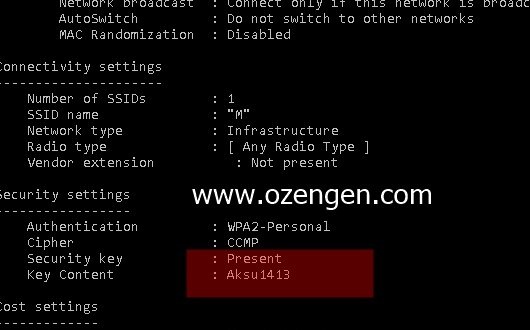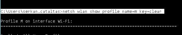 Komut satırına aşağıdaki komutu yazın. Ağ adı seçeneğini, şifresini öğrenmek istediğiniz ağ adıyla değiştirmeyi unutmayın. Örnek olarak M kablosuz ağının şifresini öğrenmek istiyorum. netsh wlan show profile name=M key=clear yazarak, aşağıdaki gibi şifreyi görüntüleyebilirim.