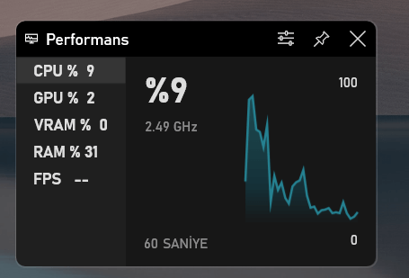 Bununla birlikte, belirli widget’ları her zaman görünür olmaları için sabitleme seçeneği vardır. Bunun için tek yapılması gereken, bu durumda CPU, GPU ve RAM okumalarını gösteren performans panelinde panelin pin simgesini etkinleştirmektir.