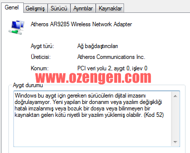 ” Windows bu aygıt için gereken sürücülerin dijital imzasını doğrulayamıyor. Yeni yapılan bir donanım veya yazılım değişikliği hatalı imzalanmış veya bozuk bir dosya veya bilinmeyen bir kaynaktan gelen kötü niyetli bir yazılım yüklenmiş olabilir. Hata kodu:52