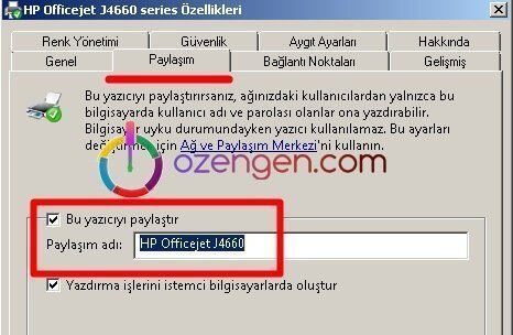 Yazıcınızın özellikler alanında yukarda bulunan sekmelerden “Paylaşım” seçeneğine tıklayın.